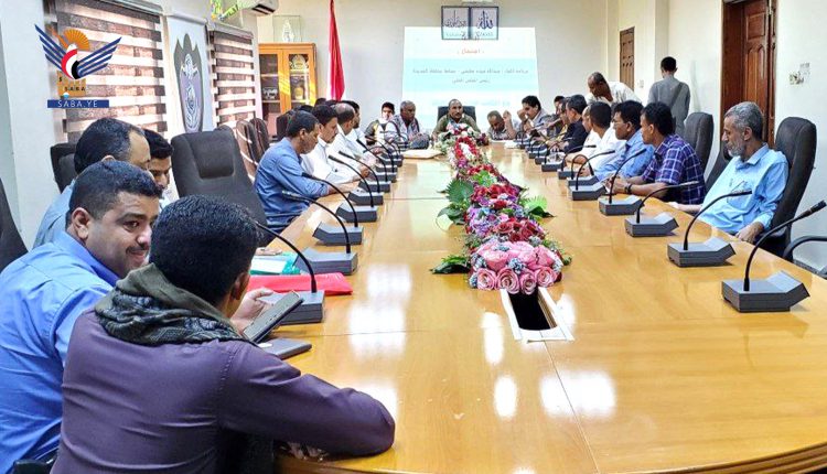 وتطرق بحضور مدراء المكاتب والمؤسسات والهيئات والجهات ذات العلاقة، الى مستوى خدمات النظافة والتحسين والتشجير بمربع مديريات مدينة الحديدة ومراكز المديريات، وإيجاد حل لتحسين مظهر سوق بيع الأسماك بالمدينة.