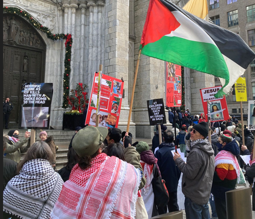 وطالب المحتجون الكاردينال تيموثي دولان رئيس أساقفة نيويورك باتخاذ موقف لإدانة “الإبادة الجماعية”، والعمل لوقف الحرب في قطاع غزة، بأسرع وقت.