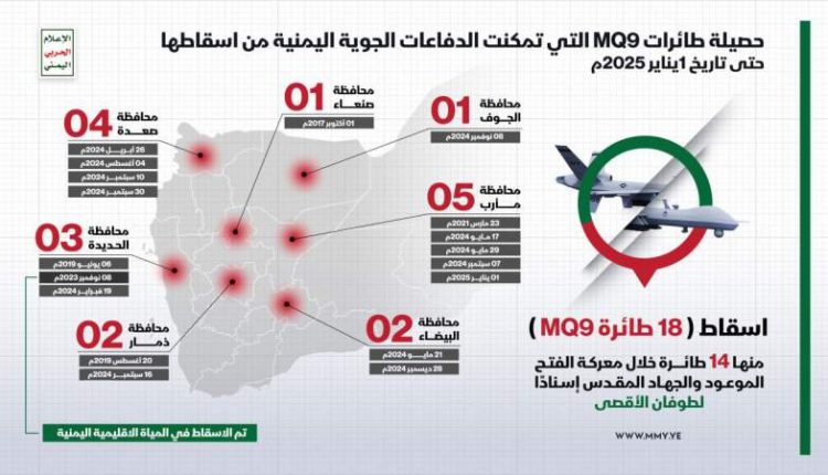 إنفوجرافيك/ إحصائية إسقاط 18 طائرة (إم كيو 9) أمريكية في أجواء اليمن On يناير 2, 2025 الصمود| إنفوجرافيك مشاركة