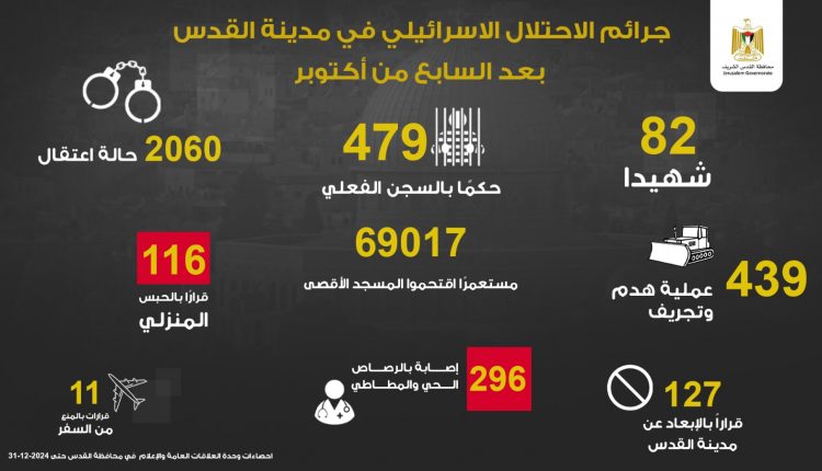 ووثقت المحافظة، اقتحام 69017 مستوطنا صهيونيا للمسجد الأقصى المبارك، بالإضافة إلى 439 عملية هدم وتجريف للمنازل والمنشآت.