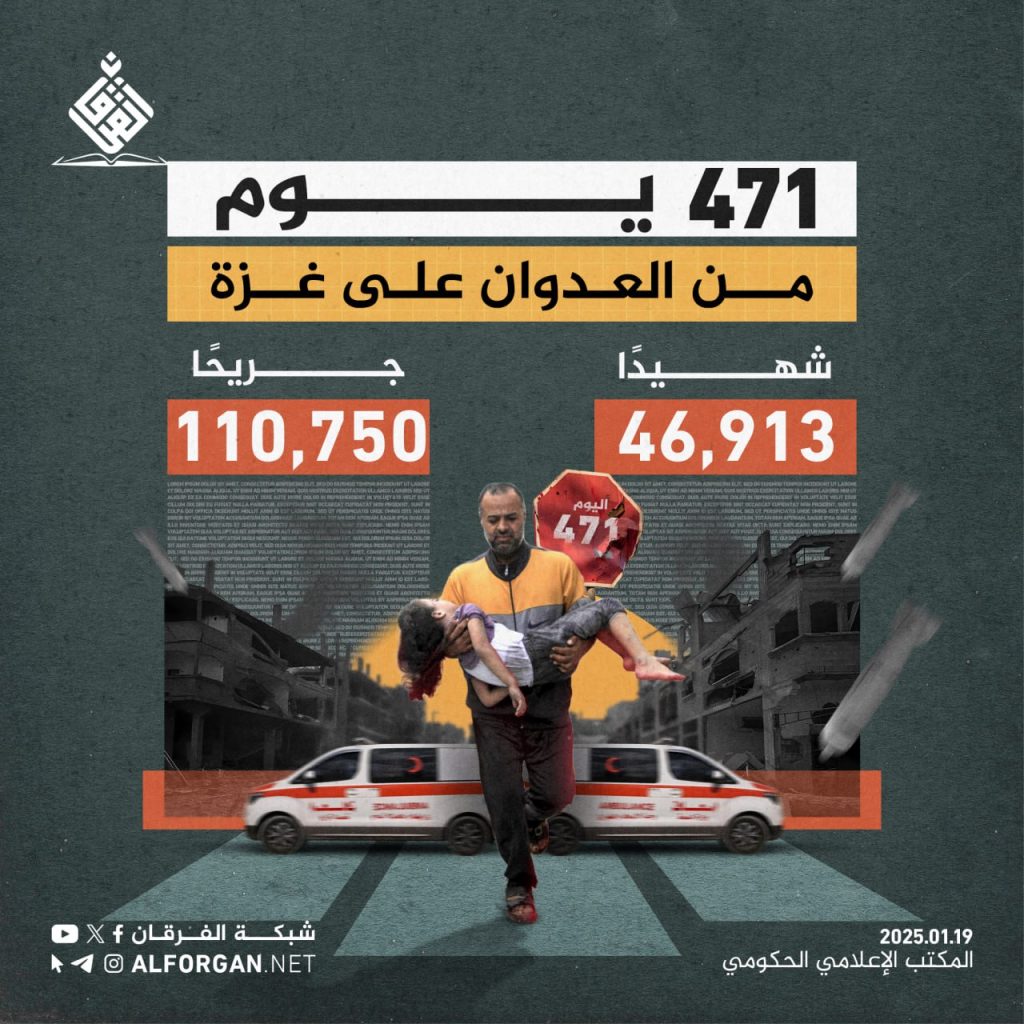 إنفو جرافيك/ إحصائية عدد الشهداء والجرحى خلال 471 يوما من العدوان الصهيوأمريكي على غزة On يناير 19, 2025 الصمود| إنفو جرافيك مشاركة