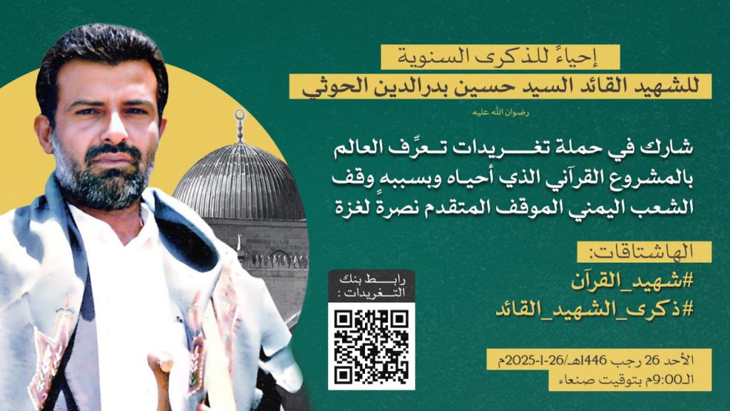 تنطلق في تمام الساعة التاسعة من مساء اليوم الأحد، حملة تغريدات على موقع التواصل الاجتماعي “إكس”، إحياءً للذكرى السنوية للشهيد القائد السيد حسين بدرالدين الحوثي.