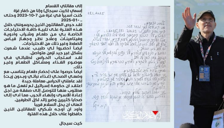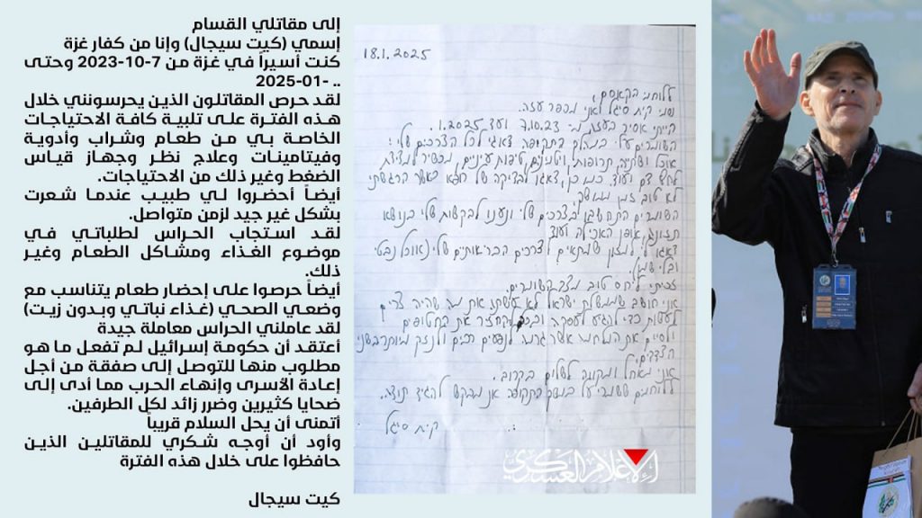 كتائب القسام تنشر: رسالة أحد الأسرى الصهاينة إلى مجاهديها الذين رافقوه خلال فترة الاحتجاز قبيل الإفراج عنه في صفقة التبادل (وثيقة) On فبراير 2, 2025 الصمود| مشاركة