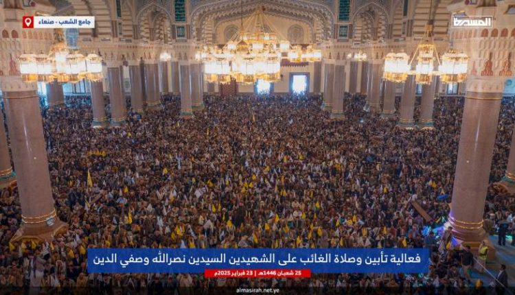 الصمود| أدى الآلاف من أبناء الشعب اليمني، صباح اليوم الأحد، في جامع الشعب والساحات المحيطة به في ميدان السبعين صلاة الغائب على شهيدي الإسلام والإنسانية السيد حسن نصر الله والسيد هاشم صفي الدين رضوان الله عليهما. ونظمت فعالية التأبين في جامع الشعب بمشاركة رسمية وشعبية كبيرة، أقيمة خلالها صلاة الغائب  على شهيدي الإسلام والإنسانية في […]