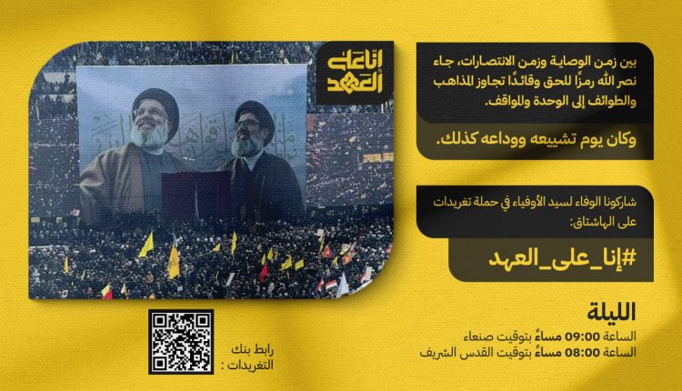 تنطلق في الساعة التاسعة من مساء اليوم، حملة تغريدات على موقع التواصل الاجتماعي “إكس” وفاء لسيد الأوفياء سماحة السيد حسن نصر الله، بعنوان” إنا على العهد”.