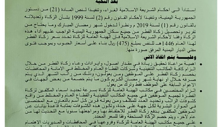 وألزمت الهيئة جميع مكاتبها وفروعها في المحافظات والمديريات بمتابعة تحصيل زكاة الفطر من جميع المكلفين وإلزام الأمناء والعقال بتقديم إقرارات زكاة الفطر “وتحصيل زكاة الفطر من جميع المكلفين خلال الشهر الكريم وتسليمها بدون تأخير وفقاً للسعر المحدد”.