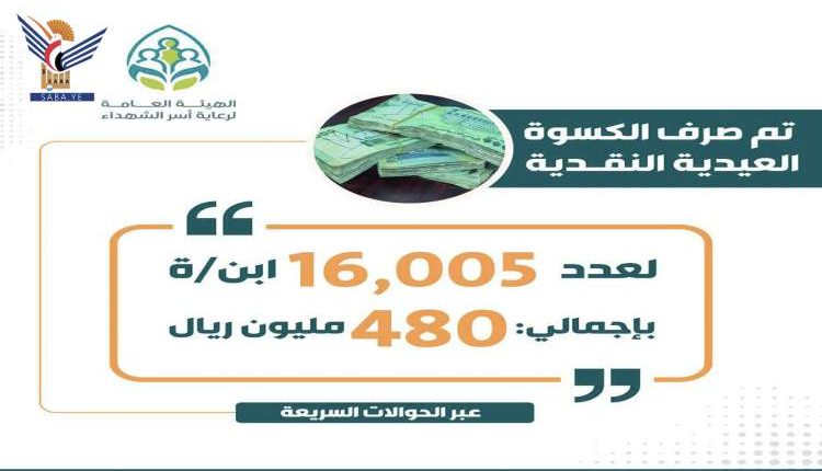 يستهدف صرف الكسوة العيدية النقدية 16 ألفًا وخمسة من أبناء وبنات الشهداء بمحافظات الحديدة، الضالع، المحويت، تعز، ريمة، شبوة، لحج ومارب” وأجزاء من محافظات “البيضاء، حجة، ذمار، صعدة وصنعاء”، بتكلفة 480 مليونًا و120 ألف ريال.