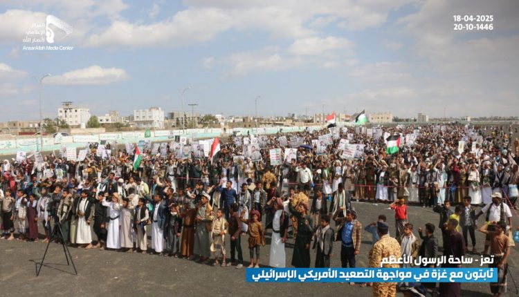 احتشد أبناء محافظة تعز اليوم في 33 ساحة بمديريات المحافظة تحت شعار “ثابتون مع غزة في مواجهة التصعيد الأمريكي والإسرائيلي”، نصرة للشعب الفلسطيني في غزة.
