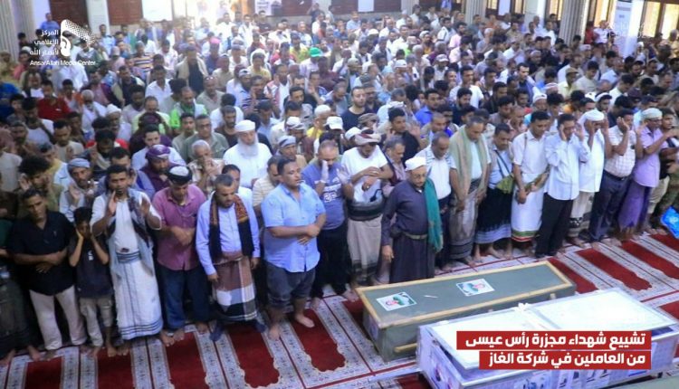 تشييع شهداء مجزرة رأس عيسى من العاملين في شركة الغاز بالحديدة