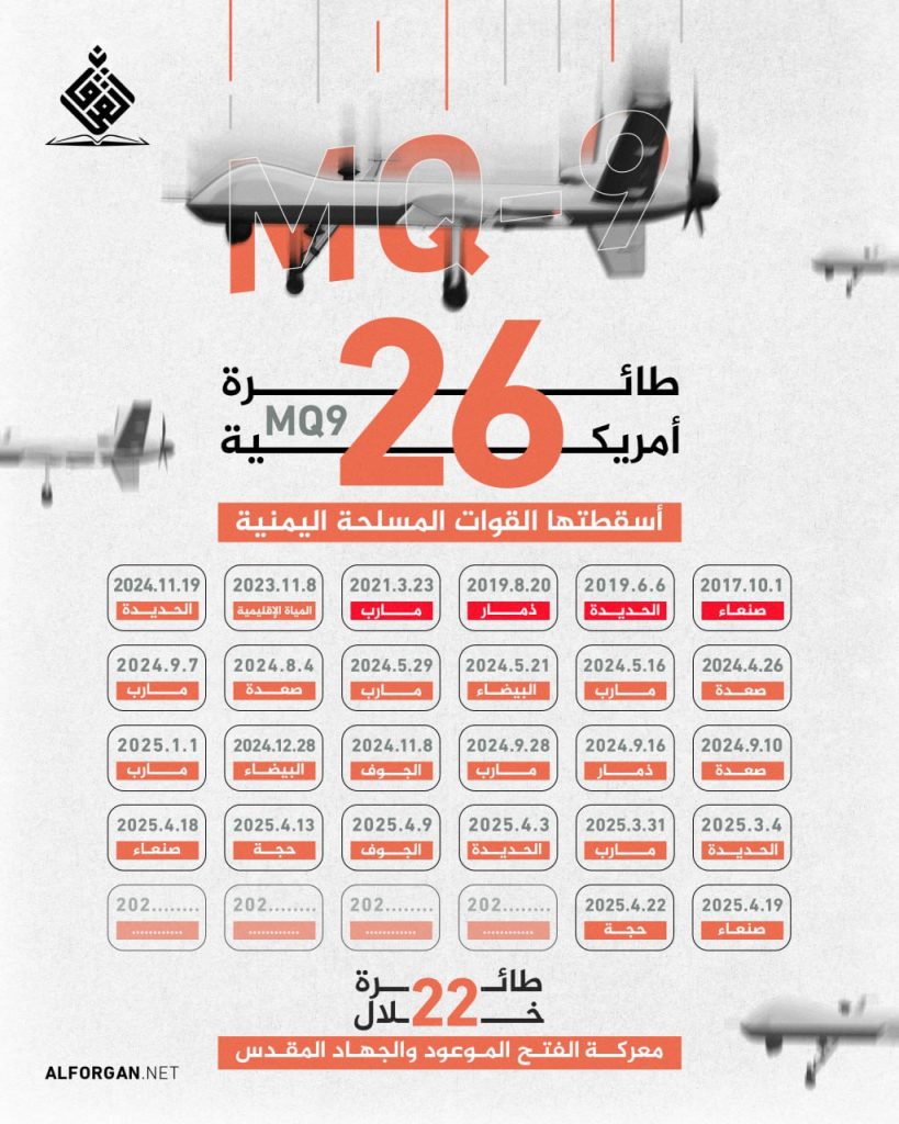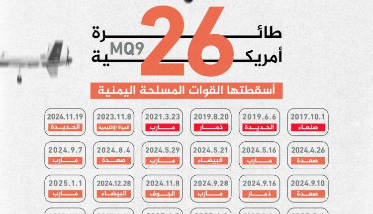 إنفو جرافيك/ كم طائرة أمريكية من نوع (MQ_9) جرى إسقاطها في اليمن On أبريل 23, 2025 الصمود| إنفو جرافيك مشاركة