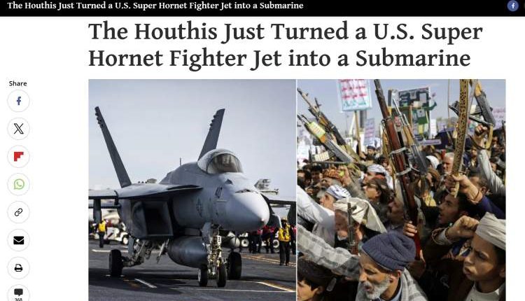 نشرت مجلة “ناشيونال ريفيو” الأمريكية تقريرًا مطولًا للكاتب جيم غيراغتي بعنوان “الحوثيون حوّلوا مقاتلة سوبر هورنيت أمريكية إلى غواصة”، تناول فيه التطورات الأخيرة في الصراع بين الولايات المتحدة اليمن في ظل تصاعد الخسائر الأميركية في العتاد العسكري.