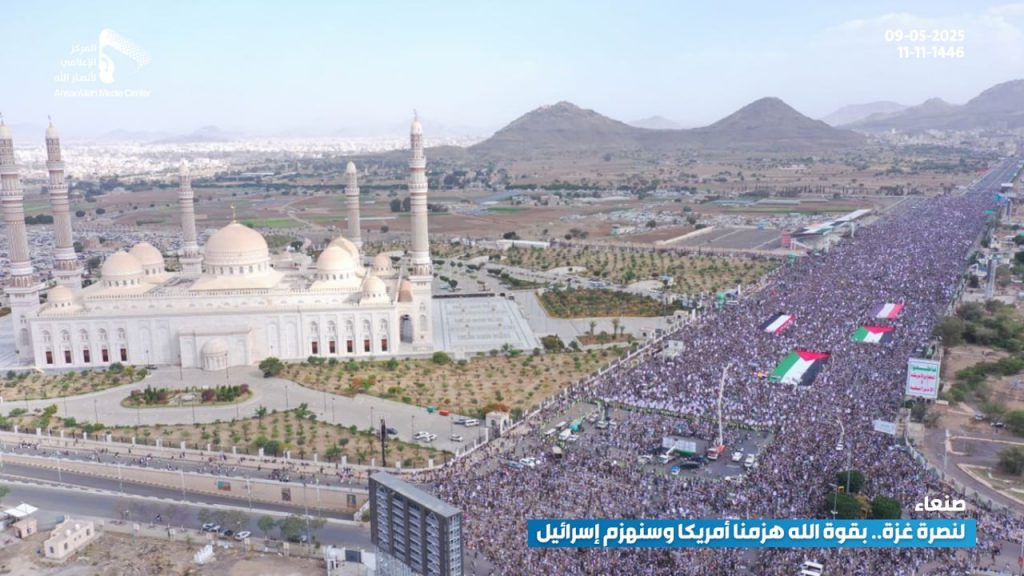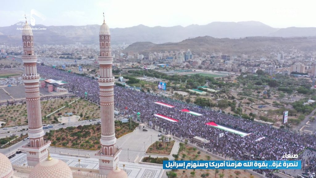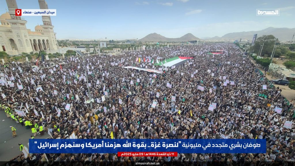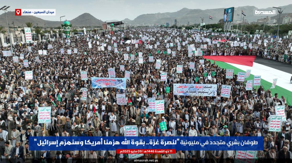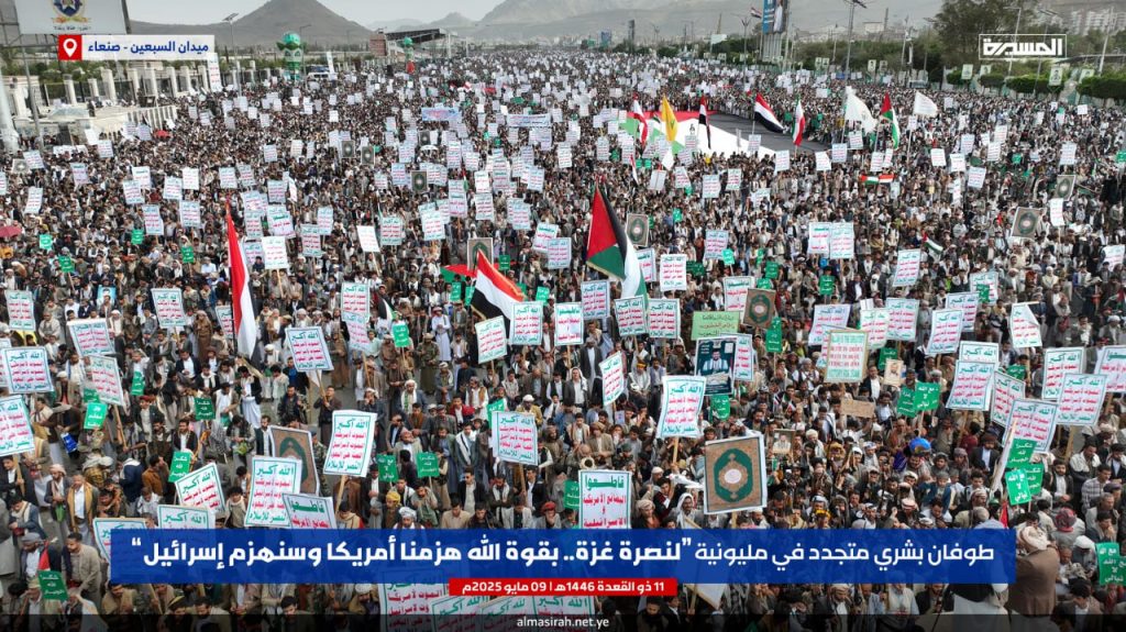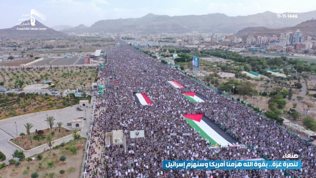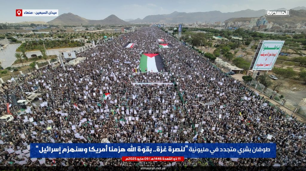 احتفالا بالفشل الأمريكي.. مسيرة مليونية بالعاصمة صنعاء تحت شعار “لنصرة غزة.. بقوة الله هزمنا أمريكا وسنهزم إسرائيل”