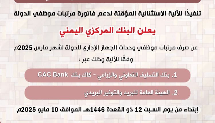 واصدر البنك بهذا الخصوص اعلان قال فيه : “تنفيذاً للآلية الاستثنائية المؤقتة لدعم فاتورة مرتبات موظفي الدولة، يعلن البنك المركزي اليمني عن صرف مرتبات موظفي وحدات الجهاز الإداري للدولة لشهر مارس 2025م.