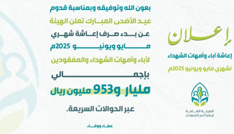 أعلنت الهيئة العامة لرعاية أسر الشهداء عن بدء صرف إعاشة آباء وأمهات الشهداء والمفقودين لشهري مايو ويونيو 2025م، بإجمالي مبلغ وقدره مليار و953 مليون ريال يمني.