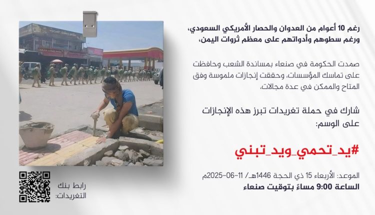 وتأتي هذه الحملة لإبراز ماحققته الحكومة في صنعاء من إنجازات ملموسة وفق المتاح والممكن في عدة مجالات، رغم 10 أعوام من العدوان والحصار الأمريكي السعودي، ورغم سطوتهم وأدواتهم على معظم ثروات اليمن وصمدت الحكومة في صنعاء بمساندة الشعب وحافظت على تماسك المؤسسات.