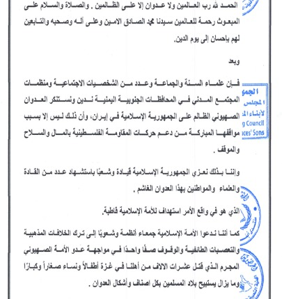 أدان علماء السنة والجماعة، وعدد من الشخصيات الاجتماعية، ومنظمات المجتمع المدني في المحافظات الجنوبية، اليوم الأحد، “العدوان الصهيوني” على الجمهورية الإسلامية الإيرانية. واعتبروا أن هذا الهجوم يأتي “بسبب مواقفها الداعمة للمقاومة الفلسطينية بالمال والسلاح والموقف”.