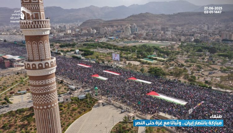 حشود مليونية في مسيرة “مباركة بانتصار إيران.. وثباتاً مع غزة حتى النصر” بميدان السبعين في العاصمة صنعاء