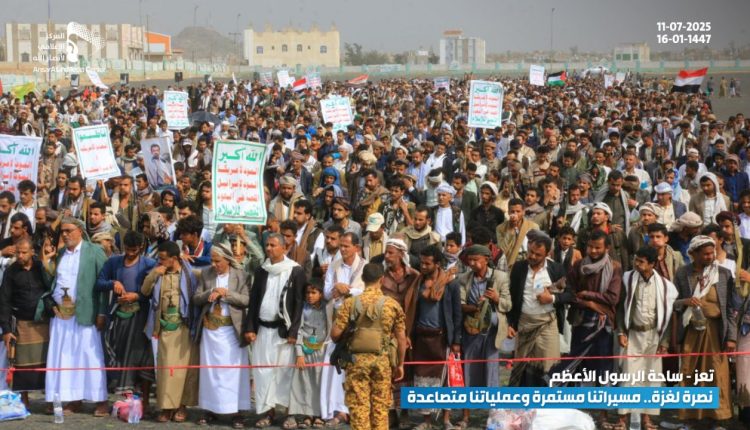 وأشار بيان صادر عن مسيرات تعز إلى أن هذه المسيرات الحاشدة تأتي استجابة لله تعالى وجهادًا في سبيله ونصرة للشعب الفلسطيني المظلوم، واستمرارًا في مواجهة الظلم والطغيان الصهيوني الذي يرتكب أبشع الجرائم الوحشية غير المسبوقة طيلة 21 شهرًا على مرأى ومسمع العالم كله.