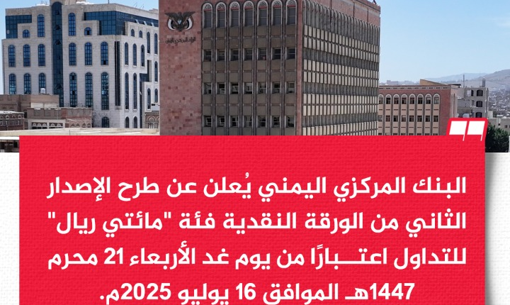 الصمود| أعلن البنك المركزي اليمني عن طرح الإصدار الثاني من الورقة النقدية فئة “مائتي ريال” للتداول اعتبارًا من يوم غد الأربعاء 21 محرم 1447هـ الموافق 16 يوليو 2025م. وأوضح البنك في بيان صادر عنه اليومٍ تلقت وكالة الأنباء اليمنية (سبأ) نسخة منه، أنه وبفضل الله وتوفيقه، وتنفيذًا لخطة البنك المركزي اليمني الخاصة بترميم ومعالجة النظام […]