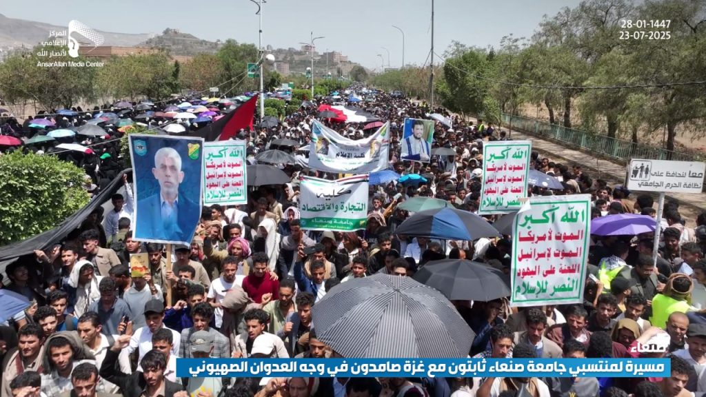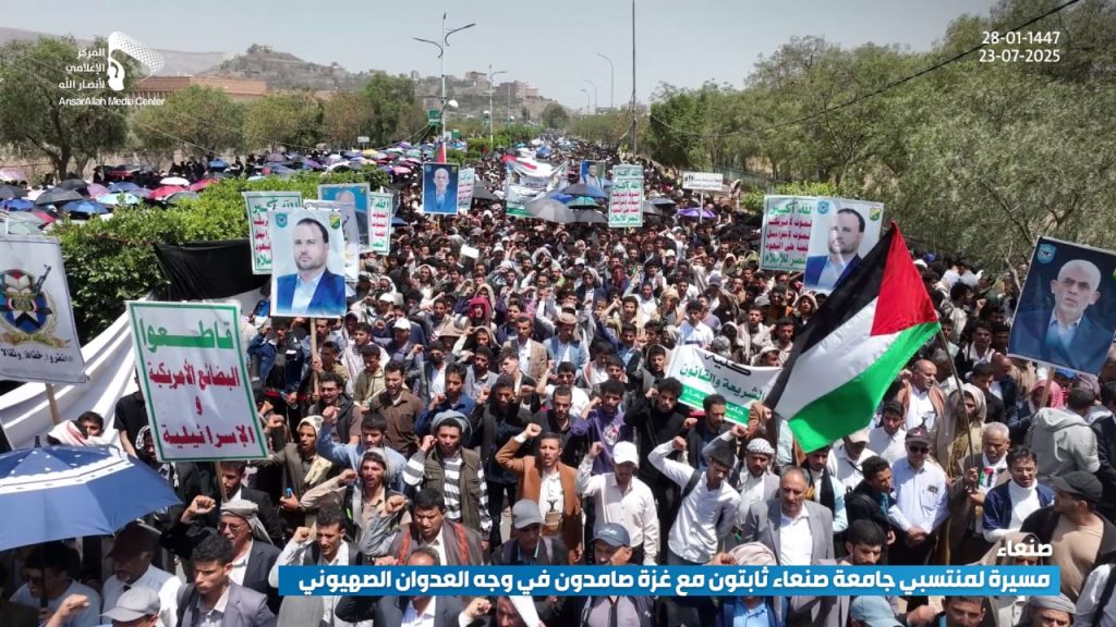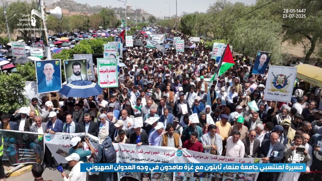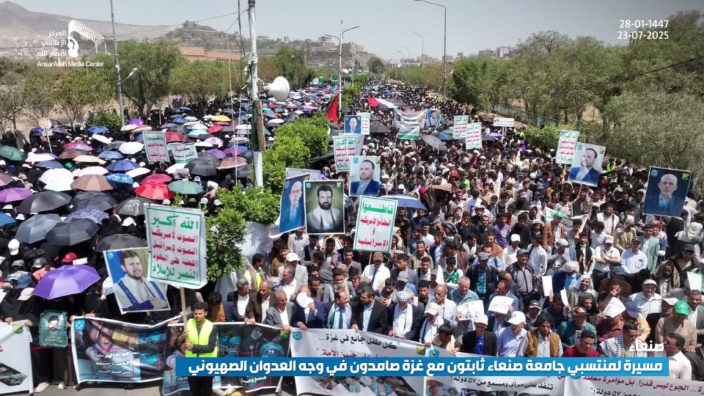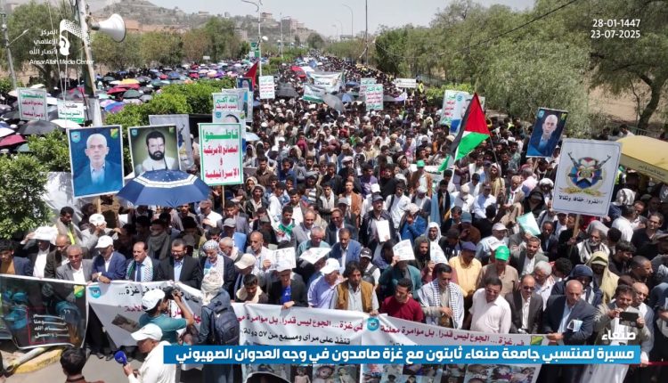 بالصور/ مسيرة حاشدة لطلاب ومنتسبي جامعة صنعاء بعنوان “ثابتون مع غزة صامدون في وجه العدوان الصهيوني” On يوليو 23, 2025 الصمود| صور| مشاركة