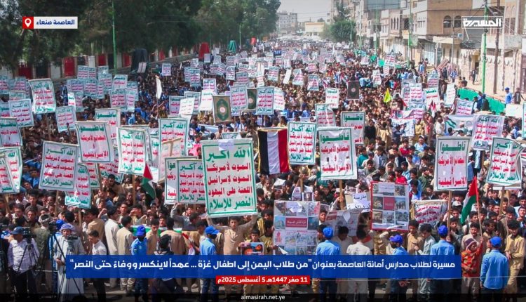 شهدت العاصمة صنعاء، اليوم، مسيرة طلابية حاشدة نصرة لأطفال غزة تحت شعار “من طلاب اليمن إلى أطفال غزة: عهد لا ينكسر ووفاء حتى النصر”.