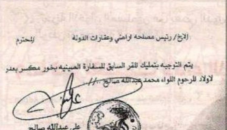 في فضيحة فساد هي الأولى من نوعها، كشفت وثيقة رسمية صادرة عن الهيئة العامة للأراضي وعقارات الدولة عن توجيهات مباشرة من عفاش بتمليك مقر السفارة الصينية في منطقة خور مكسر بمدينة عدن لأولاد أخيه.
