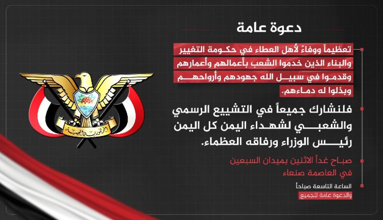 دعت اللجنة المنظمة للفعاليات الجميع إلى الحضور والمشاركة في التشييع الرسمي والشعبي لشهداء اليمن، رئيس مجلس الوزراء ورفاقه العظماء، والذي سيتم في الساعة التاسعة من صباح يوم غد الإثنين في ميدان السبعين بالعاصمة صنعاء.