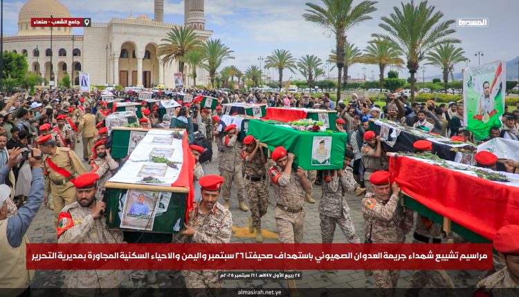 صنعاء تودّع 32 شهيدًا من فرسان الكلمة قضوا في قصف صهيوني غادر
