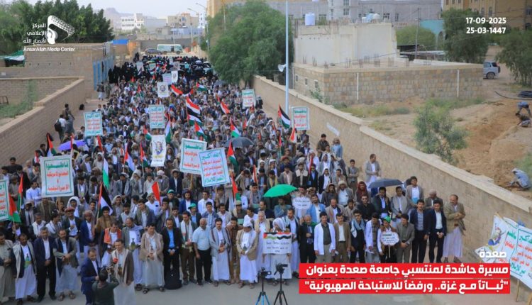 مسيرة حاشدة بجامعة صعدة تحت شعار “ثباتًا مع غزة.. ورفضا للاستباحة الصهيونية”