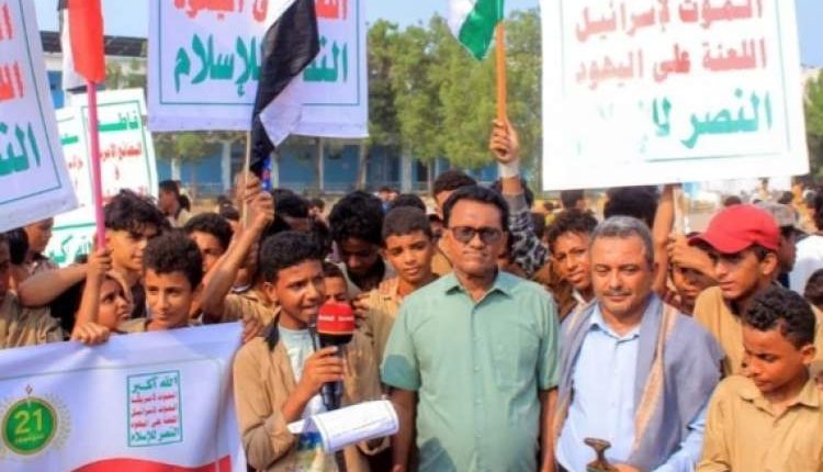 وفي المسيرة التي تقدمها مدير المديرية جماعي سالم، ومسؤول القطاع التربوي مصطفى المغارم، رفع الطلاب العلمين اليمني والفلسطيني، مرددين الهتافات المؤكدة على الموقف الثابت تجاه القضية الفلسطينية والمنددة بالعدوان الصهيوني على غزة، والصمت الدولي تجاه الجرائم المرتكبة بحق المدنيين.