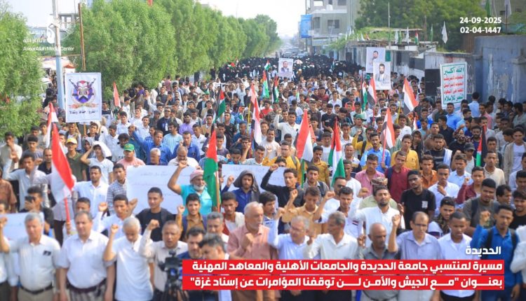 مسيرة جماهيرية لمنتسبي جامعة الحديدة والجامعات الأهلية والمعاهد المهنية بالحديدة دعمًا لغزة