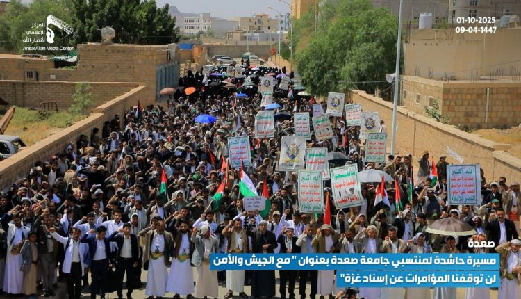 مسيرة حاشدة بجامعة صعدة تحت شعار “مع الجيش والأمن لن توقفنا المؤامرات عن اسناد غزة”