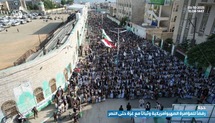 ورددوا هتافات مناهضة لاستمرار جرائم الإبادة الجماعية التي يرتكبها العدو الإسرائيلي، بدعم أمريكي وأدواتهما من المرتزقة والعملاء، مؤكدين أن مخططات الكيان الصهيوني، وشريكه الأمريكي، عبر ما يسمى بخطة ترامب، لن تحقق لكيان العدو ما عجز عنه في عامين من مجازر الإبادة والعدوان والحصار والتجويع والتعطيش ومحاولات التهجير القسري.