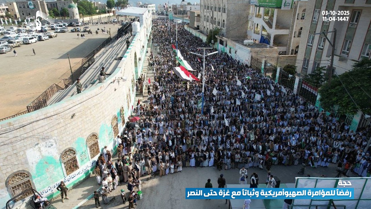 وعبر أبناء حجة في المسيرات التي تقدمها المحافظ هلال الصوفي وأمين عام محلي المحافظة إسماعيل المهيم ووكلاء المحافظة ومسؤول التعبئة عن رفضهم لخطة المجرم ترامب الهادفة دعم تنفيذ مخططات الكيان الصهيوني، وإنشاء ما يسمى بـ “إسرائيل الكبرى”.