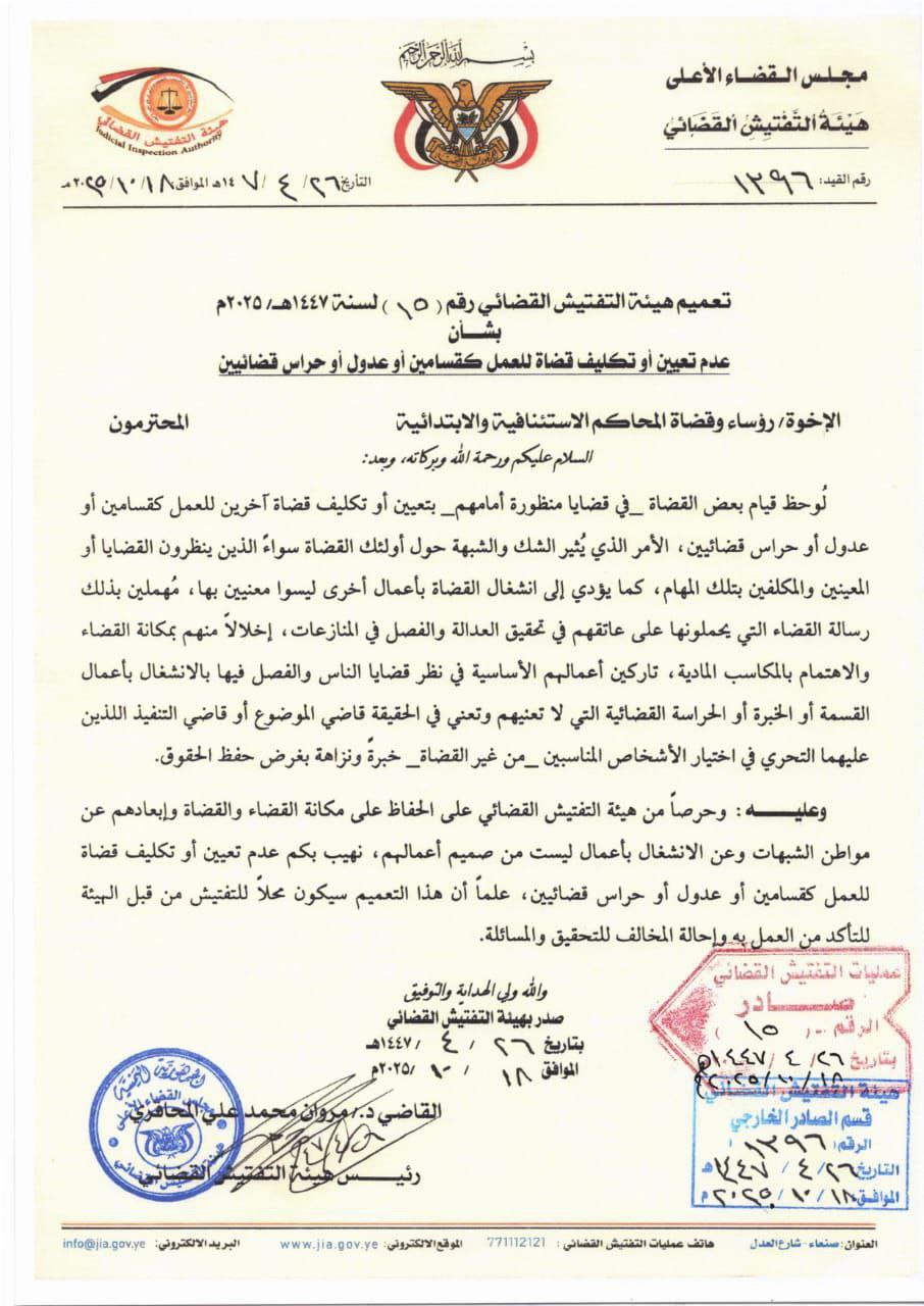 تعميم هيئة التفتيش القضائي رقم ( ١٥ ) لسنة ١٤٤٧هـ / ٢٠٢٥م بشأن عدم تعيين أو تكليف قضاة للعمل كقسامين أو عدول أو حراس قضائيين