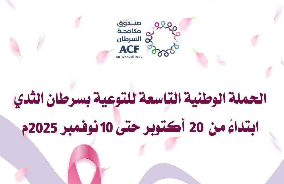 دشّن صندوق مكافحة السرطان الحملة اليوم الوطنية التاسعة للتوعية بسرطان الثدي، والتي تستمر خلال الفترة من ٢٠ أكتوبر وحتى 10 نوفمبر 2025م، تحت شعار يهدف إلى تعزيز الوعي المجتمعي بأهمية الكشف المبكر ودوره المحوري في رفع معدلات الشفاء.