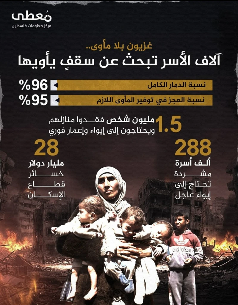 أفاد مركز معلومات فلسطين (معطى)، اليوم الثلاثاء، بأن قطاع الإسكان في غزة يعاني أزمة غير مسبوقة، بعد أن فقد نحو 1.5 مليون شخص منازلهم جراء الدمار الذي خلفه العدوان الإسرائيلي، ما يجعلهم بحاجة ماسة إلى إيواء وإعمار فوري.