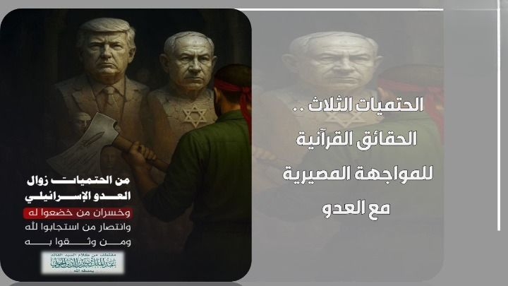 أكد السيد القائد يحفظه الله ، على قاعدة إيمانية راسخة، أن الصراع مع العدو الإسرائيلي ليس مجرد خلاف سياسي أو صراع جغرافي، بل معركة بين الحق والباطل، بين من استجابوا لله، ومن تولّوا أعداءه، وفي قلب هذه الرؤية، ترتكز ثلاث حتميات قرآنية يرى السيد القائد أنها ليست فقط وعوداً ربانية، بل سنناً إلهية لا تتخلف، مهما طال الزمن، أو اشتدت المؤامرات.