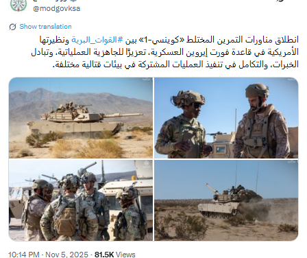 وأفادت وزارة الدفاع السعودية، في بيان، بـ”انطلاق مناورات التمرين المختلط كوينسي-1 بين القوات البرية ونظيرتها الأمريكية”.