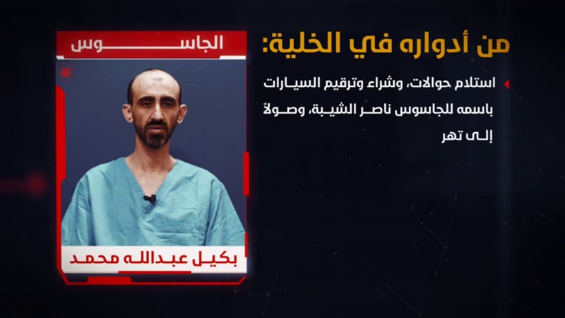 ويقر الجاسوس بكيل عبد الله محمد في اعترافات جديدة له بثها الإعلام الأمني لوزارة الداخلية اليوم بأدواره الخبيثة في التجسس لصالح العدو، حيث اقتصرت مهمته في استلام الحوالات وشراء وترقيم السيارات باسمه لحساب الخائن الكبير ناصر الشيبة وصولاً إلى تهريب الخائن ناصر من صنعاء إلى تعز، وقد تم القبض عليه بعد عودته من تعز إلى صنعاء عقب تهريب الخائن الشيبة.