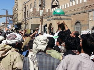 وعقب الصلاة أقيمت وقفة لأبناء الحي تنديد بجرائم العدوان السعودي الأمريكي