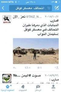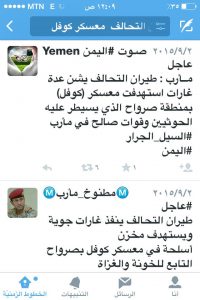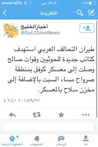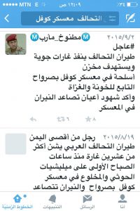 اعلام العدوان يفضح نفسة “مسجد كوفل” On مارس 18, 2017 عندما كان طيران العدوان يقصف “كوفل” وكان في يد ابطال الجيش واللجان الشعبية كان كوفل معسكرا ولما صار في يد الغزاة والمرتززقة وقصفه ابطال الجيش واللجان الشعبية صار جامعا تابعا للاوقاف..!! اخبارهم شاهدة عليهم.. مشاركة