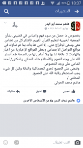 علماً ان الدكتور احمد الشامي لم يكتفي بهذا المنشور الذي اخلا فيه المحامي هاشم الحوثي مسؤوليته عن تلك الاتهامات لإثبات زيف تلك التهم والافتراءات التي وجهت له ولقيادات انصار الله من قبل المدعو قطران وزمرته ، مؤكداً انه قد وكل احد المحاميين برفع دعوى قضائية نيابة عنه ضد القاضي عبدالوهاب قطران لإثبات زيف ما ادعاه ومحاسبته على ذلك.