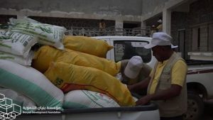 دشنت مؤسسة بنيان التنموية عبر مشروعها الإغاثي التنموي «أغنياء من التعفف» عملية توزيع السلال الغذائية بمحافظة الحديدة.
