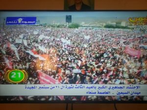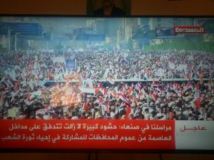 تتوافد في هذه الأثناء حشود جماهيرية كبيرة إلى ميدان في العاصمة صنعاء للمشاركة في المسيرة الجماهيرية الكبرى إحياء لذكرى للذكرى الثالثة لثورة الحادي والعشرين من سبتمبر.