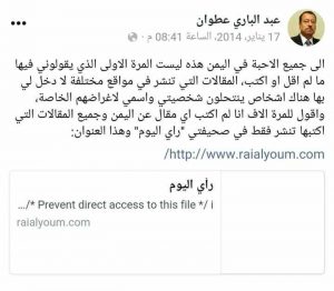 وكان عطوان قد أصدر موقفاً منذ ما قبل بدء العدوان على اليمن بأن لا يُعبِّرُ عنه إلا ما نُشر في صحيفته الإلكترونية “رأي اليوم”.