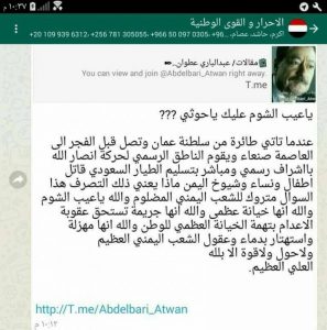 وحَضَّ عطوان اليمنيين بالذات على تحري الدقة في كل ما يُنسب إليه من قبل المفترين الذين اعتادوا أن يقوّلوا كتاباً كباراً وعطوان أحدهم ما لم يقولوه…
