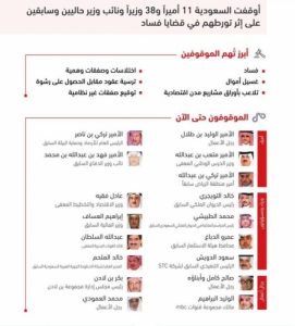 نُشرت، اليوم الأحد، قائمة بأسماء الأمراء والمسؤولين السعوديين الموقوفين رهن التحقيق على خلفية قضايا فساد في المملكة العربية السعودية.