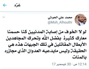 وقال رئيس اللجنة الثورية فجر اليوم السبت في تغريده له على “التويتر” ” لولا الخوف من إصابة المدنيين كنا حسمنا معارك كثير بفضل الله وتحرك المجاهدين الأبطال المقاتلين في تلك الجبهات هذه هي الحقيقة وليس ما يدعيه العدوان الذي مجازره بالمئات”