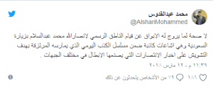 وأكد محمد عبدالقدوس نائب رئيس مجلس إدارة وكالة الأنباء اليمنية سبأ ، في تغريدة على حسابه بـ”تويتر” ، أن “لا صحة لما يروج له الابواق عن قيام الناطق الرسمي لانصارالله محمد عبدالسلام بزيارة السعودية”.